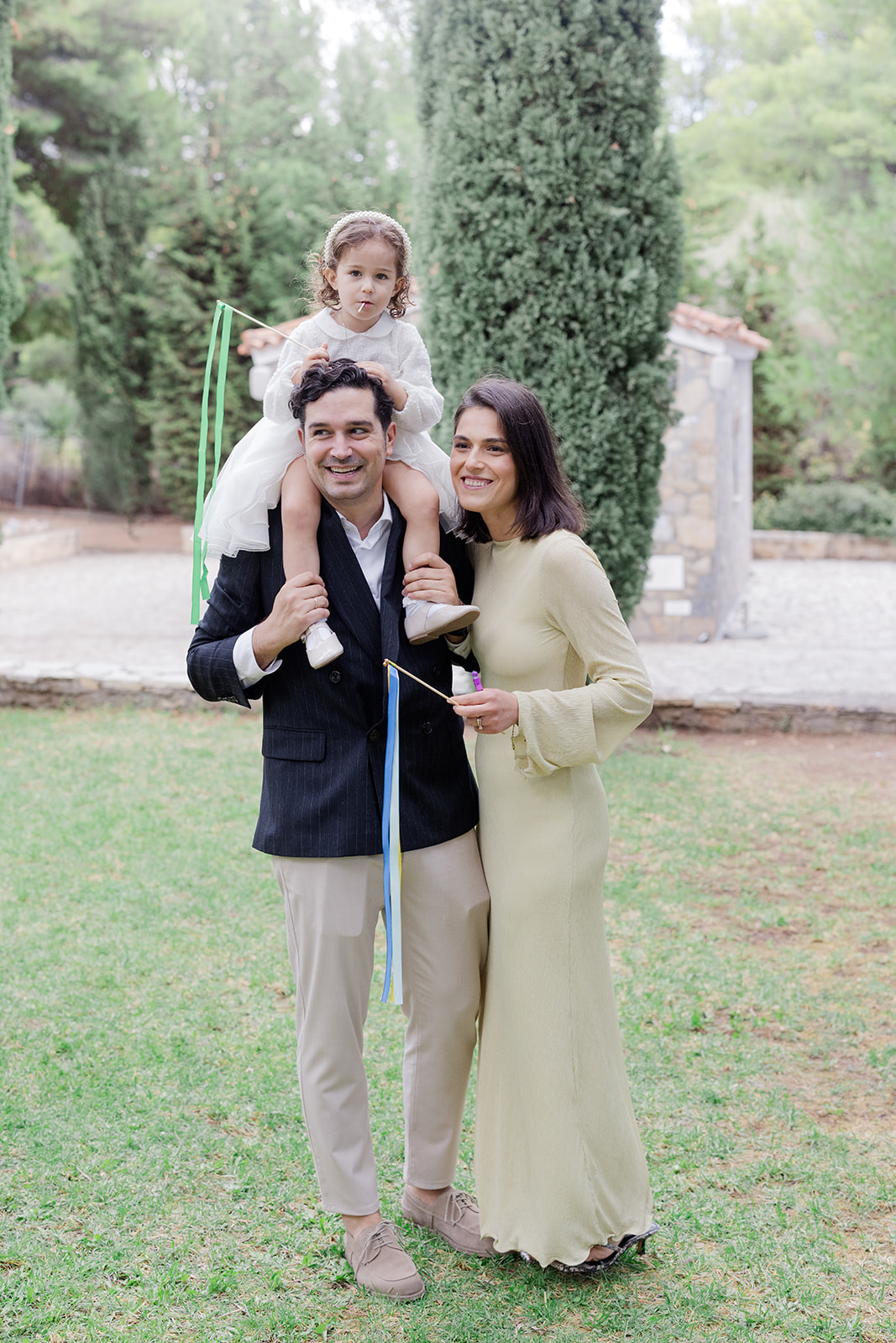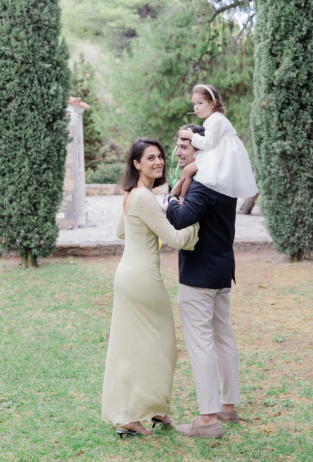 Αμέσως μετά, ο καταπράσινος, δασώδης χώρος του κτήματος μας χάρισε το ιδανικό φυσικό στούντιο για τα οικογενειακά πορτρέτα. Χωρίς στημένες πόζες, μόνο με καθαρή χαρά. Ο μπαμπάς έβαλε τη μικρή Αντριάνα στους ώμους του —εκείνη κρατώντας ένα ραβδάκι με κορδέλες που ανέμιζαν— και η μαμά τους κοιτούσε με εκείνο το βλέμμα της απόλυτης οικογενειακής ευτυχίας.