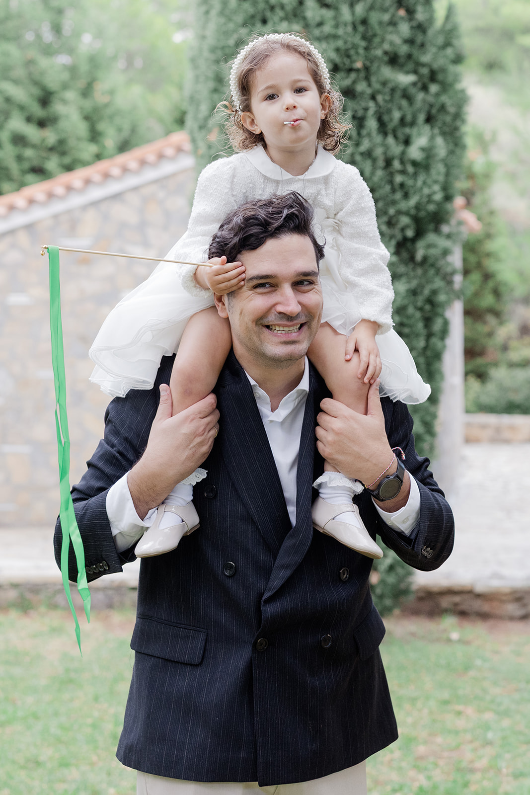 Αυτό όμως που έκανε τη συγκεκριμένη ημέρα να ξεχωρίζει δεν ήταν μόνο το μαγευτικό σκηνικό, αλλά τα αληθινά συναισθήματα. Ως φωτογράφος που αγαπά τη fine-art αισθητική και το storytelling, αναζητώ πάντα αυτές τις αυθόρμητες στιγμές που λένε την πραγματική ιστορία. Και εδώ, είχαμε άφθονες. Η τρυφερή αγκαλιά και το φιλί του μπαμπά στο μάγουλο της Αντριάνας καθώς την κρατούσε προστατευτικά, τα συγκινημένα βλέμματα των γονιών και των νονών την ώρα που διάβαζουν τις προσευχές, και φυσικά, τα γεμάτα περιέργεια ματάκια των μικρών παιδιών που παρακολουθούσαν το μυστήριο ψιθυρίζοντας μεταξύ τους. Αυτές είναι οι λήψεις που αποκτούν ανεκτίμητη αξία στο πέρασμα του χρόνου.
