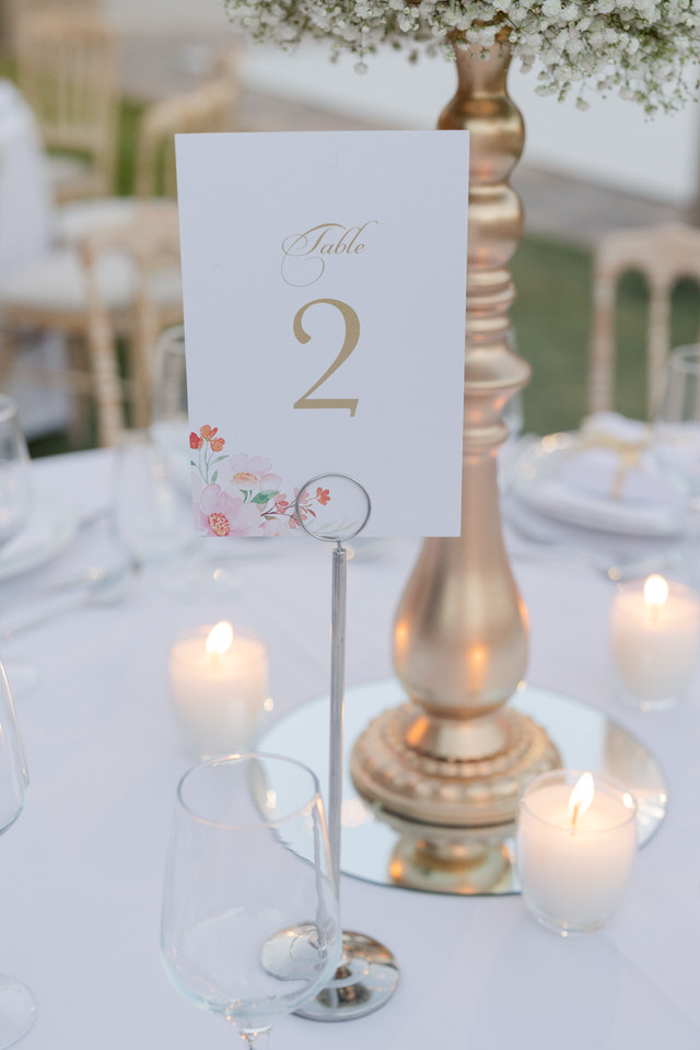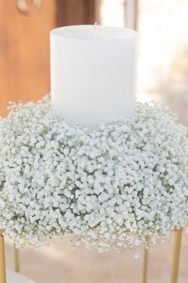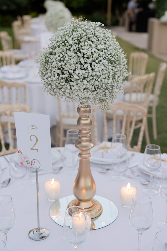 Καθώς έπεσε η νύχτα, ο Πύργος μεταμορφώθηκε σε ένα ρομαντικό παραμύθι. με πλούσια μπουκέτα από Baby’s Breath.