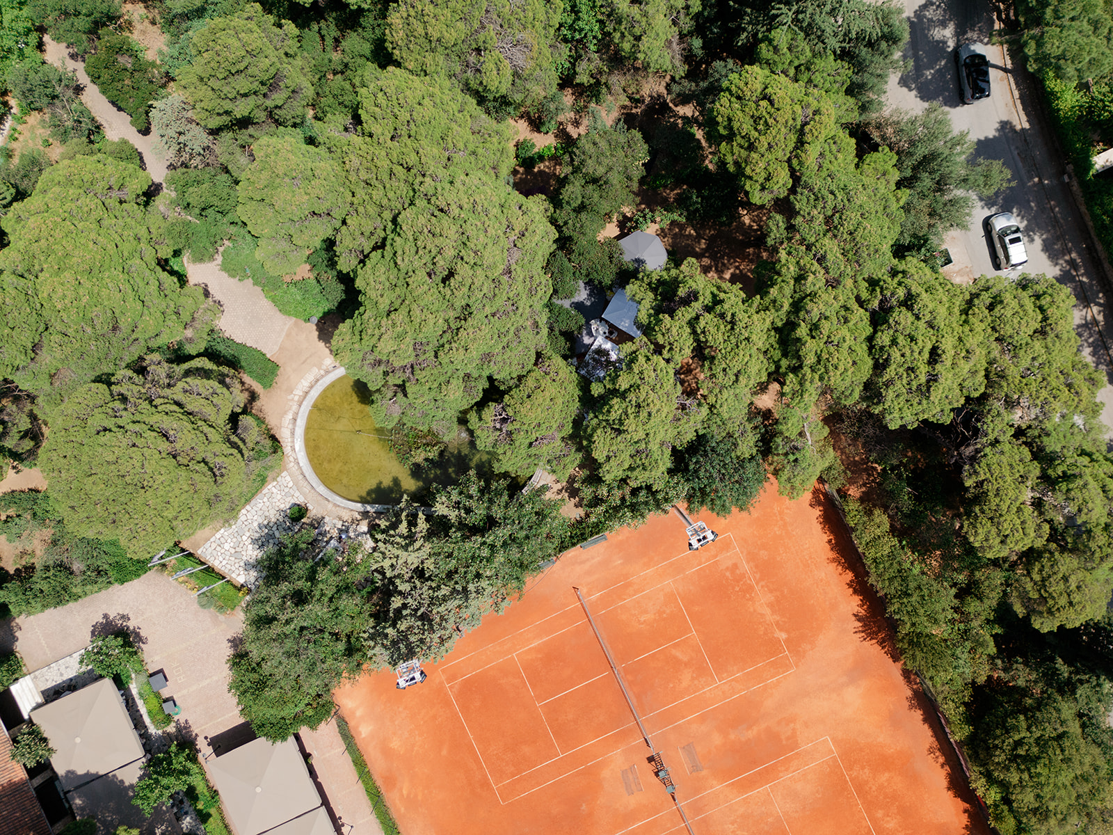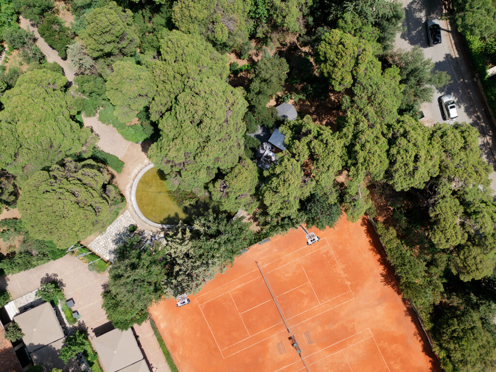 Το δείπνο στήθηκε στον καταπράσινο κήπο με φόντο το πέτρινο συντριβάνι, ακριβώς πλάι στα γήπεδα του τένις.