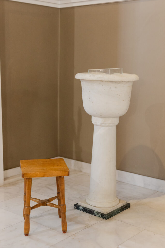 Δεν υπάρχει η ένταση της “βουτιάς” στην κολυμβήθρα, αλλά αντίθετα, η τρυφερή στιγμή της επίχυσης του ύδατος.