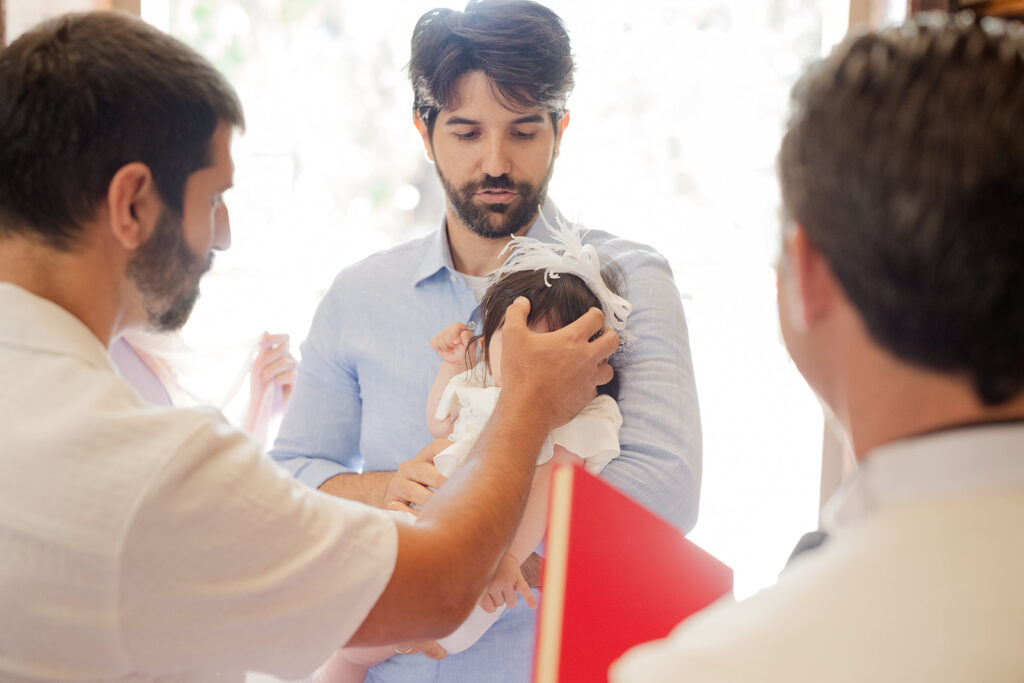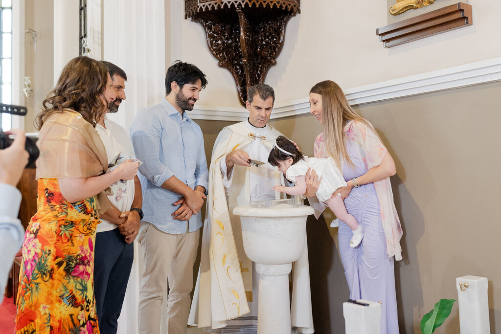 Ο ιερέας με λευκά άμφια, ρίχνει απαλά το νερό στο μέτωπο του παιδιού και οι γονείς – νονοί στέκονται ακριβώς δίπλα,