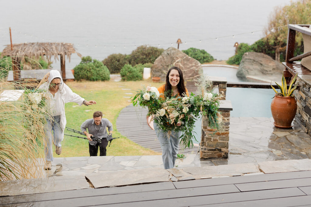I watched them move the ceremony setup—chairs, flowers, and arch—from the cliffside to safety.
